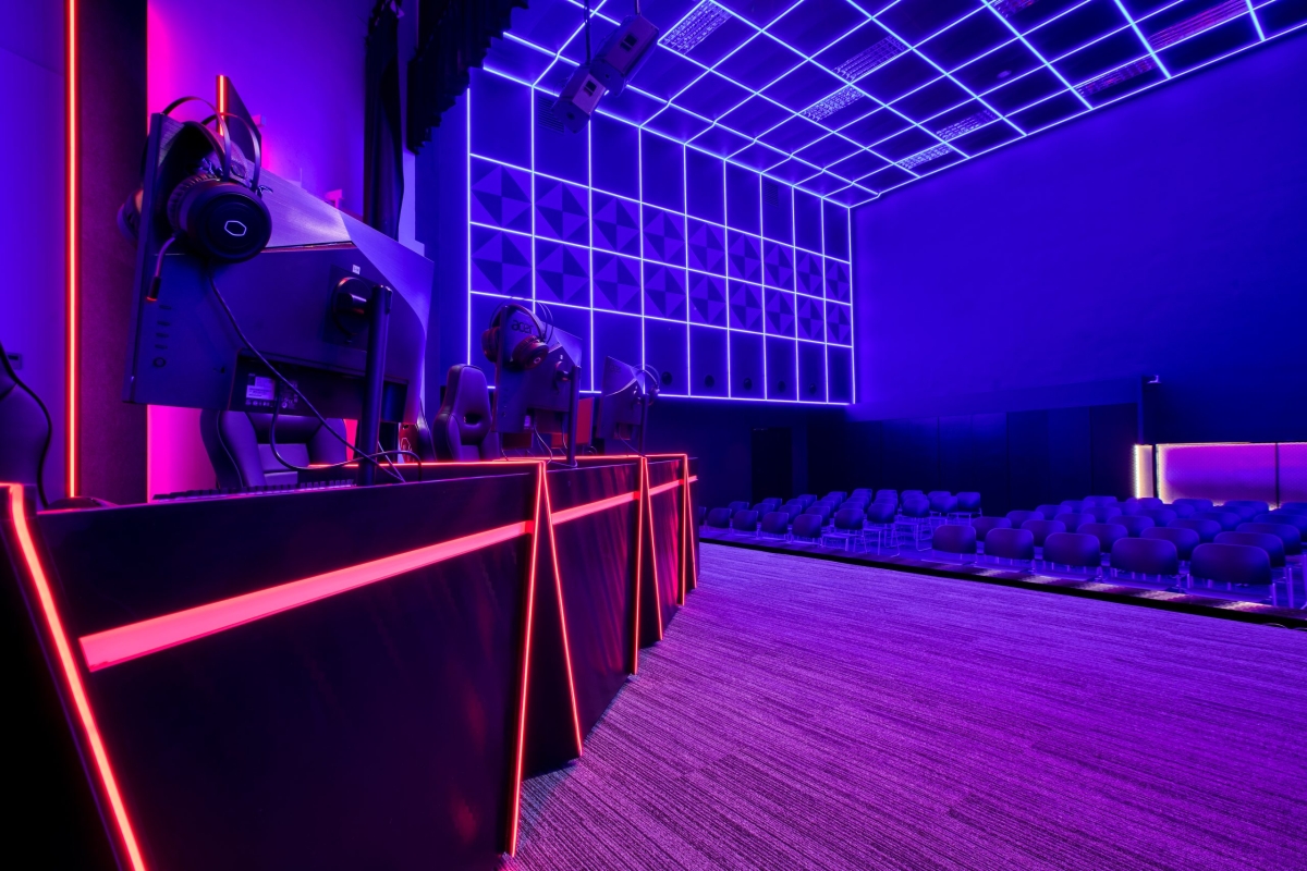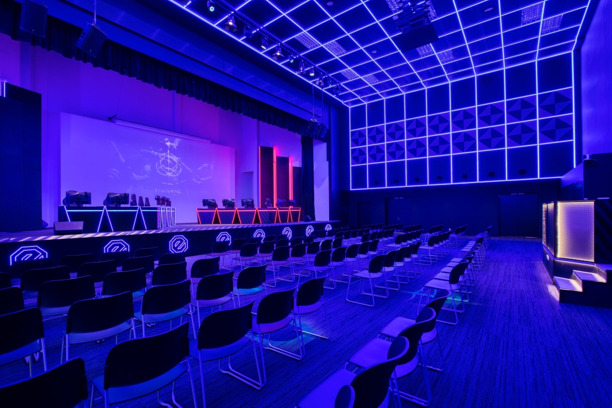 The design theme takes visuals references from the cult classic films ‘Tron’ and ‘Star Wars’ with an emphasis on neon and colour changing LED lights technology. The AV equipment installed supports online virtual studio broadcasting and a virtual tournament platform with a large LED screen wall that’s accompanied by an immersive sound and theatrical lighting system.