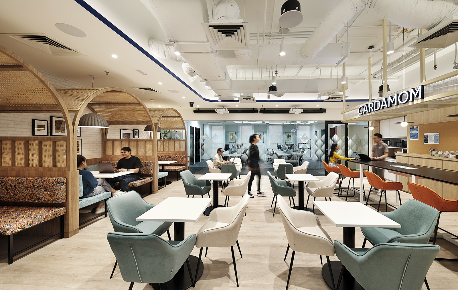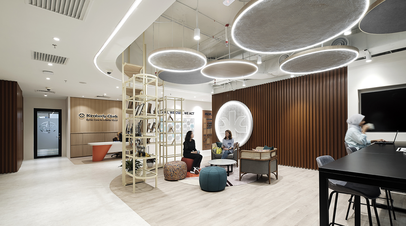 The Kimberly-Clark office in Kuala Lumpur, Malaysia, has been transformed into a dynamic and engaging workspace. The design philosophy revolves around adaptability, catering to a range of work styles and preferences. By offering various work settings, including spaces for informal work, relaxation, focused work, private calls, and both open and closed meetings, the office promotes collaboration and productivity. This multifunctional approach recognizes the evolving nature of work, ensuring that employees can choose the environment that best suits their tasks and needs throughout the day.